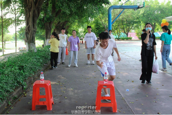 其次,开展了“携手共进强国路”环节。工作人员事先在地上标记好两条平行线,小组成员需在两条平行线外,每人两手臂间放置一瓶水,两人双手互相支撑前行。选手之间配合的十分默契,十分迅速地完成挑战。