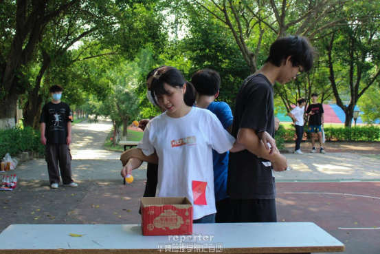 然后,进入了“正青春应号召,跻身强国有我”环节。工作人员在瓶子上放一个瓶盖,团队可以通过两人三足的方式拾取工作人员事先放在地上带有习近平总书记“七一”重要讲话内容的卡片。小组成员需用手捂住一只眼睛,原地转四圈,然后走到瓶子前用另一只手去弹瓶子上的瓶盖,若成功弹掉瓶盖,则继续比赛流程。反之失败则需重头再来。收集完成了六张卡片后,选手们需要朗读卡片上“七一”重要讲话内容。各组选手安排得十分仔细,各司其职,共同完成挑战。
