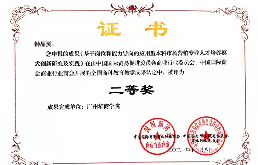 为进一步推动商科教育领域专业课程体系和教育教学方法的改革,展示我国商科教育领域取得的优秀教学成果,中国国际商会商业行业商会和中国国际贸易促进委员会商业行业委员会经研究,决定面向全国商科教育领域的各普通高等院校开展商科教育教学成果评选工作。我校威廉希尔中文网站钟晶灵老师报送的教育教学改革成果《基于岗位和能力导向的应用型本科市场营销专业人才培养模式创新研究及实践》,在众多成果中脱颖而出荣获全国二等奖。
