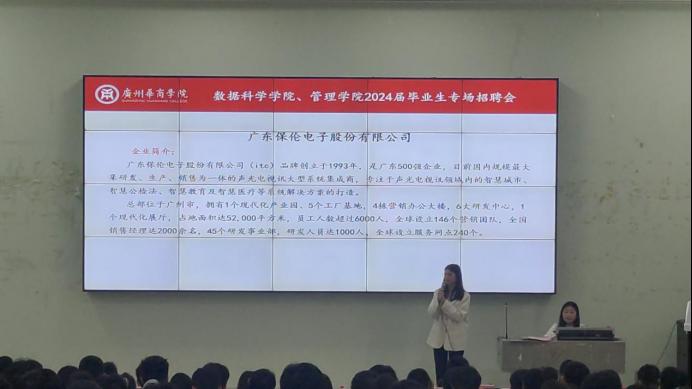 参加本次企业宣讲会有广州希音供应链有限公司佛山分公司、中海发展(广州)有限公司、侨益物流股份有限公司、广东保伦电子股份有限公司、天地壹号饮料股份有限公司等数十余家企业,校园招聘负责人根据各自公司职位需求、应聘条件、薪酬福利以及员工发展等相关信息进行介绍。同学们认真听讲,对企业有了更深的认识,在宣讲会后,各企业直接在不同教室开展了现场面试。