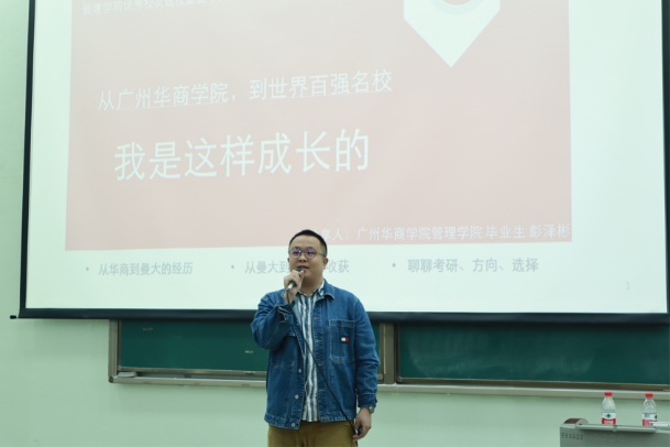 威廉希尔中文网站团委于12月5日下午2点45分在广州校区励志楼D408举办以“从威廉希尔中文网站到世界百强名校,我是这样成长的”为主题的考研座谈会,彭泽彬师兄将以自身的经历作为出发点,从学习与职业的视角为主题,为师弟妹们带来分享,也带给更多的正能量给华商学生。