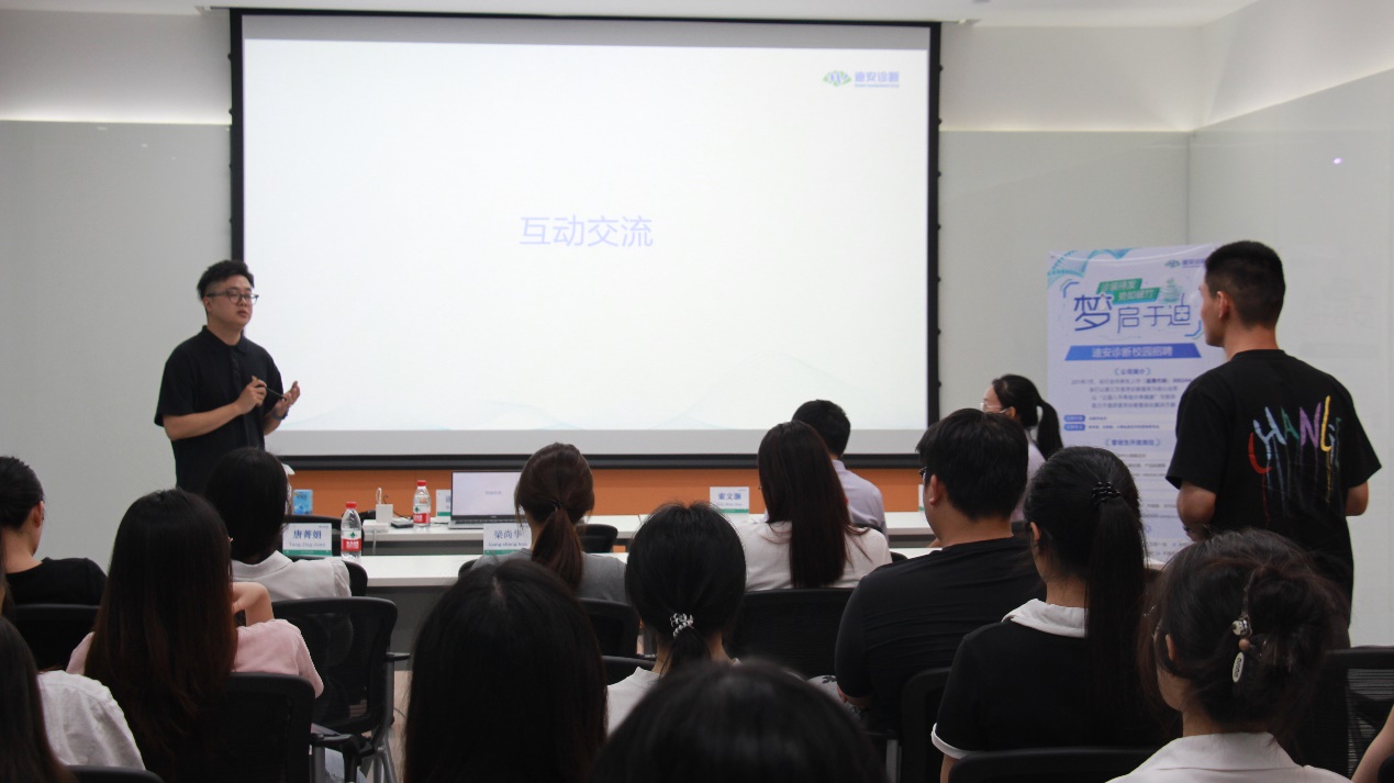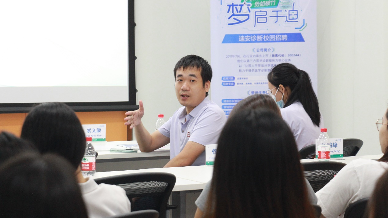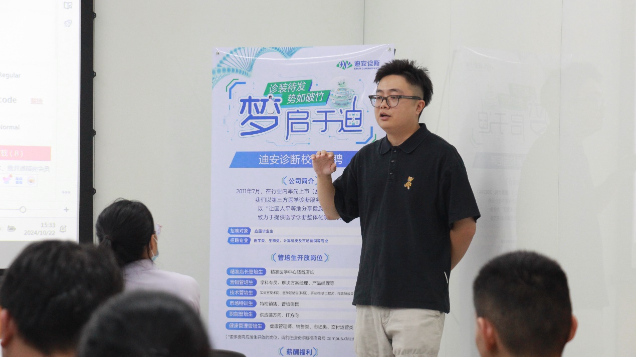 人力资源主管谢寿丽随后为学生们介绍了迪安诊断的公司发展战略及其人才发展通道,重点分享了公司在引进和培养高端医疗技术人才方面的措施与成果。她还鼓励学生们关注第三方医学诊断行业的发展机遇,并欢迎未来有志于从事该领域的毕业生加入迪安诊断。
