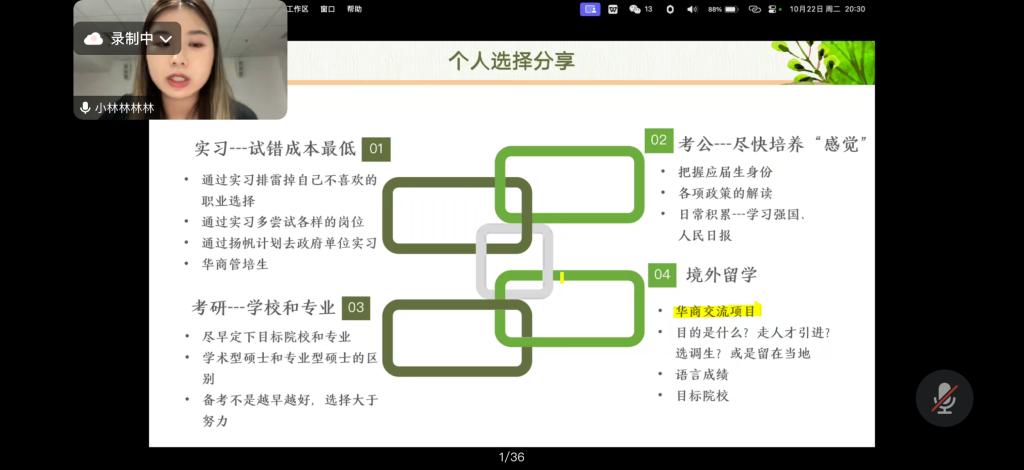 随后,学姐坦诚地分享了自己选择考研的心路历程,并对“考公、考研、就业”三大路径进行了深入细致的分析。在谈到生涯选择时,学姐建议同学们通过实习进行深度的自我认识。例如可以通过“扬帆计划”争取到政府部门的实习机会,或通过“BOSS直聘”等平台寻找企业的实习岗位,以此探索适合自己的职业道路。