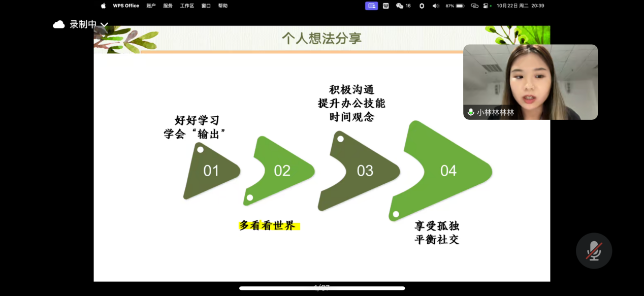 为引导我校学子精准定位未来奋斗目标,科学规划大学四年学习生涯,威廉希尔中文网站携手校友办于2024年10月22日19时30分倾心打造了一场主题为“大学生活:探索、体验与自我发现之旅”的精彩分享会。本次分享会采用腾讯会议线上平台进行,荣幸邀请到2022届杰出校友林盈洁学姐担任主讲嘉宾,与我校学子共话成长之路。