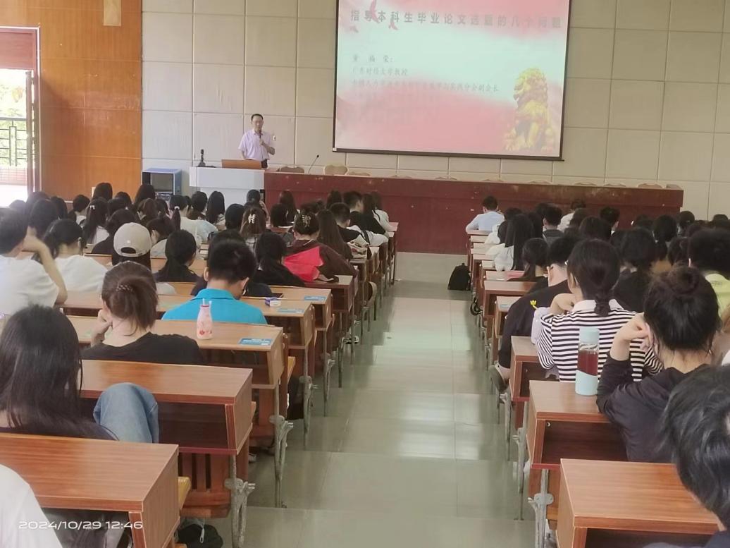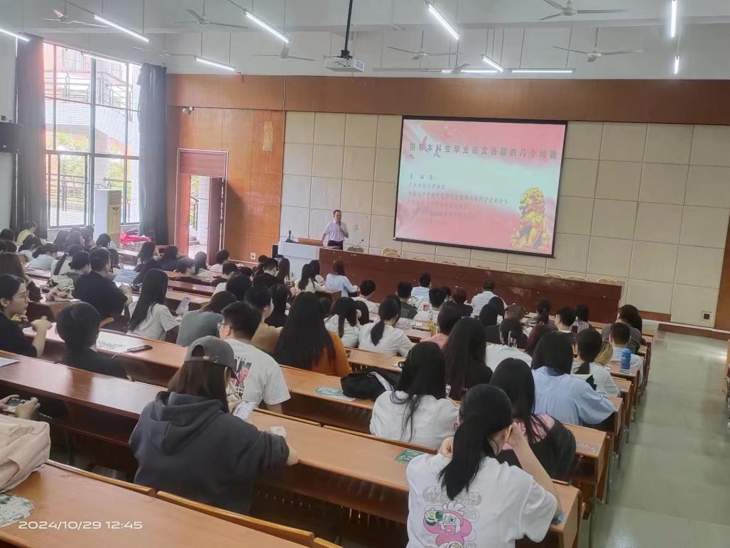董教授作为从教四十余年的资深高校教师,具备多年指导本科生和硕士研究生毕业论文的经验,首先他向在场的学生提出要认识到选题在毕业论文写作的重要性,所谓选好一个题目论文就成功一大半,选题是写好论文的关键,是学生顺利完成毕业的先决条件。董教授进一步分享指出选题能够决定论文的价值和效用,要想选好论文题目要经过反复推敲、多方思索、相互比较、精心策划,良好的选题可以反映出一个人的知识储备,也可以看出一个人的文字功夫。接着他向同学们提问“同学们思考一下,以下三个题目哪个题目比较好:知识经济背景下知识型员工离职率研究、发展新质生产力对企业用工的影响研究、新业态下的劳动权益保护研究——基于增城区部分劳动者的调研”。学生的回答各不相同,董教授也为同学们一一分析了三个不同题目好与坏,获得在场学生的频频点头认同。