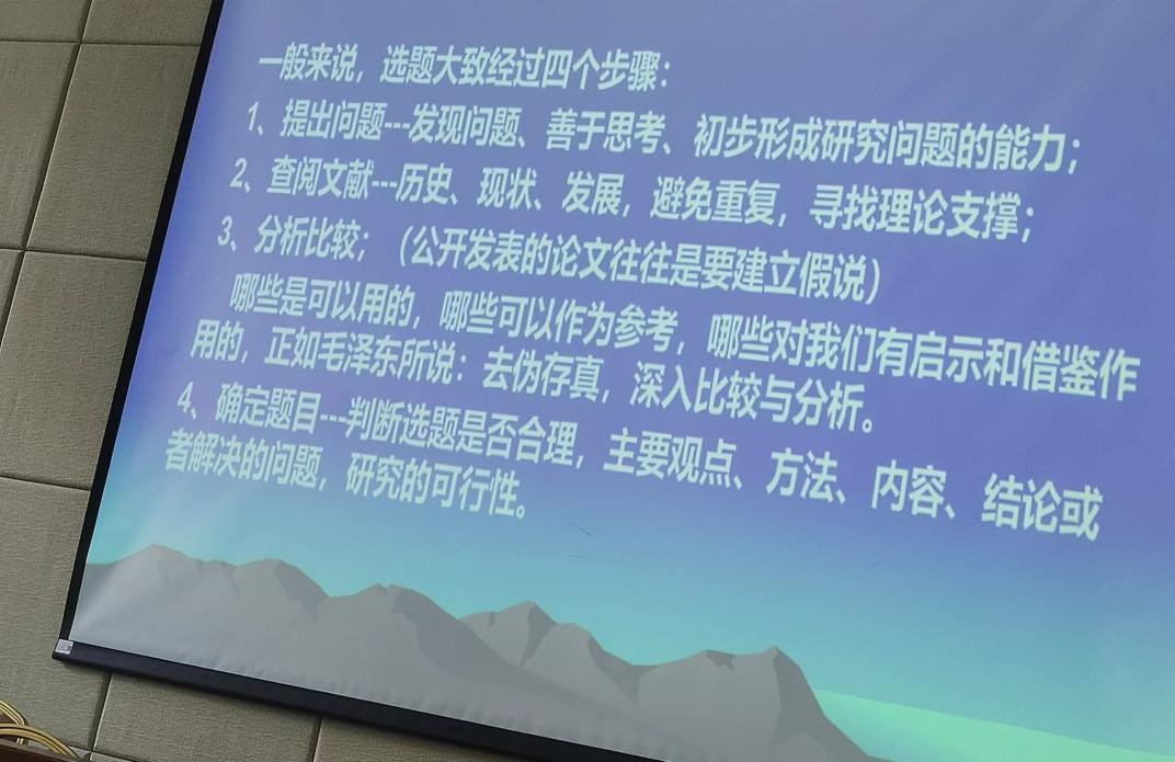 在分享选题依据之后,董教授继续分享选题的过程,董教授指出一般来说,选题大致经过四个步骤:第一,提出问题-发现问题、善于思考、初步形成研究问题的能力;第二,查阅文献--历史、现状、发展,避免重复,寻找理论支撑;第三,分析比较(公开发表的论文往往是要建立假说):哪些是可以用的,哪些可以作为参考,哪些对我们有启示和借鉴作用的,正如毛泽东所说“去伪存真,深入比较与分析”;第四,确定题目-判断选题是否合理,主要观点、方法、内容、结论或者解决的问题,研究的可行。