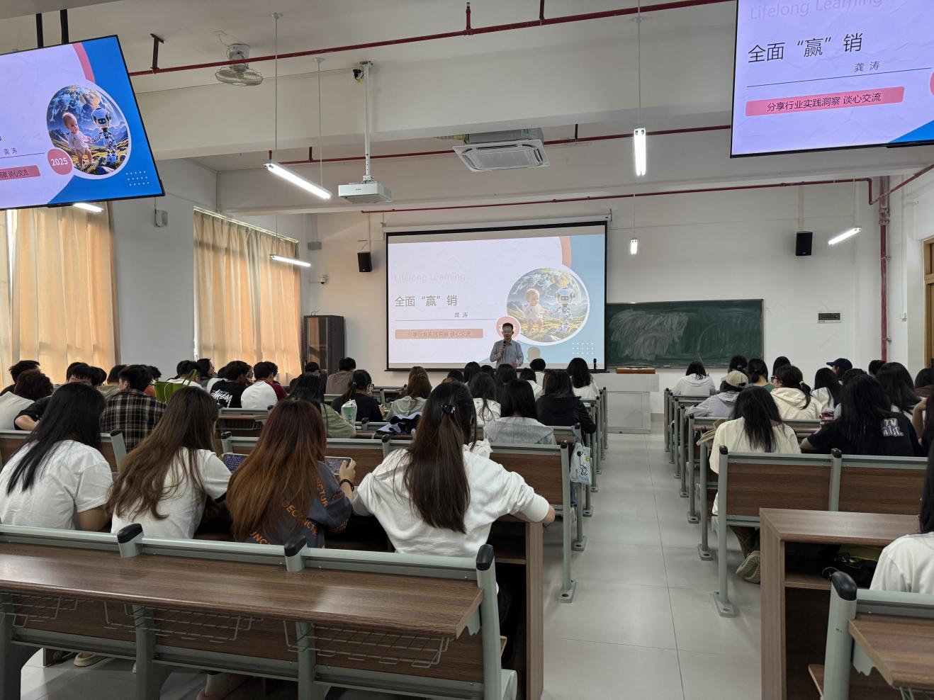 龚涛博士则以其30年跨国企业营销管理经验,深入剖析消费品行业营销模式演变及AI与大数据的赋能场景。作为《全面“赢”销》作者,他通过OGSM模型(目标、策略、衡量、执行)拆解销售战略落地关键,并分享雀巢、宝洁等头部企业的智能化营销实践。“AI+BI技术已从个人玩具升级为企业生产力工具,”龚博士指出,“未来的营销人才需兼具数据分析能力与战略思维,才能在快速变革的行业中立足。”他还以“老销售的两点建议”寄语学生:终身学习以应对不确定性,平衡健康与事业以实现可持续成长。
