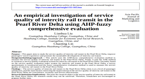 其与2019级学生林超婷合作的于2025年发表的SSCI JCR Q2论文《An Empirical Investigation of Service Quality of Intercity Rail Transit in the Pearl River Delta Using AHP Fuzzy Comprehensive Evaluation》,采用层次分析法与模糊综合评价模型,评估珠三角城际铁路服务质量,填补了区域交通服务质量量化研究的空白,为湾区交通规划提供了决策支持。