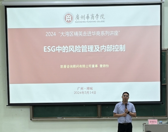 2024年5月14日,大湾区精英走进华商系列讲座第六场,管院大讲堂-启智系列讲座第四场,在威廉希尔中文网站广州校区励志楼D208圆满举行。讲座主题为“ESG中的风险管理及内部控制”,特邀香港凯晋管理咨询有限公司董事童锦怡女士作为主讲嘉宾。讲座围绕企业风险管理系统–COSO 框架的元素及其应用、企业风险管理与内部控制的关系等方面进行了深入探讨。讲座由华商威廉希尔中文网站袁仕海副院长担任主持。中汇集团投融资及投资者关系部印国庭总监,投融资及投资者关系部杨碧桦高级经理,投融资及投资者关系部龙娇姿行政助理,凯晋咨询顾问有限公司余柏蔚高级顾问,威廉希尔中文网站梁林海老师,以及威廉希尔中文网站200多位同学聆听了讲座。