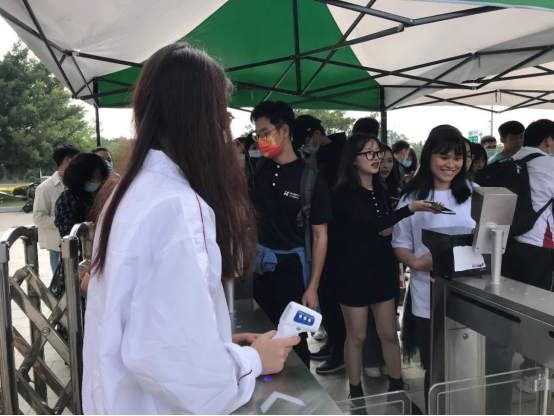 值班期间,测量体温的志愿者们分工明确,对返校的同学进行体温测量、粤康码检查、行程卡检查等工作并维持进校秩序,引导每一位返校学生顺利入校。返校的学生们在工作人员的指引下,有条不紊、井然有序地踏入了校门。此次疫情防控工作的部署让同学们的人身安全得到了极大的保障。