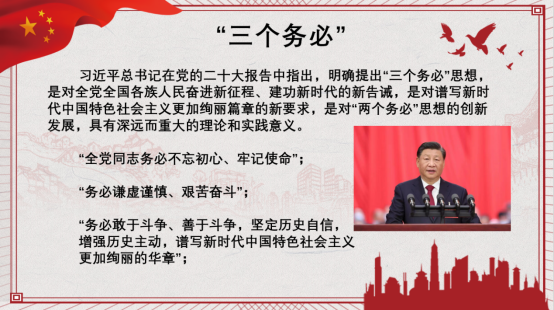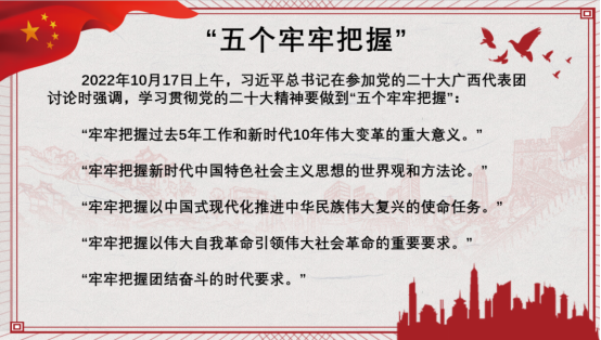 习近平总书记在党的二十大报告中指出,明确提出“三个务必”思想,是对全党全国各族人民奋进新征程、建功新时代的新告诫,是对谱写新时代中国特色社会主义更加绚丽篇章的新要求,是对“两个务必”思想的创新发展,具有深远而重大的理论和实践意义。2022年10月17日上午,习近平总书记在参加党的二十大广西代表团讨论时强调,学习贯彻党的二十大精神要做到“五个牢牢把握”。
