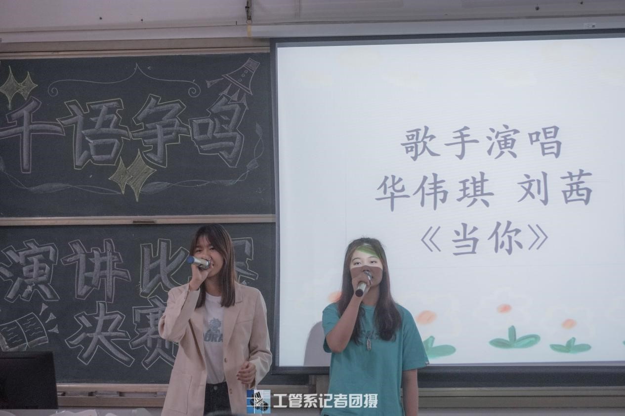 然后,由工管系艺术团歌手队队员刘茜和华伟琪上台演唱了曲目《当你》,美妙的歌声舒缓了现场紧张的气氛。