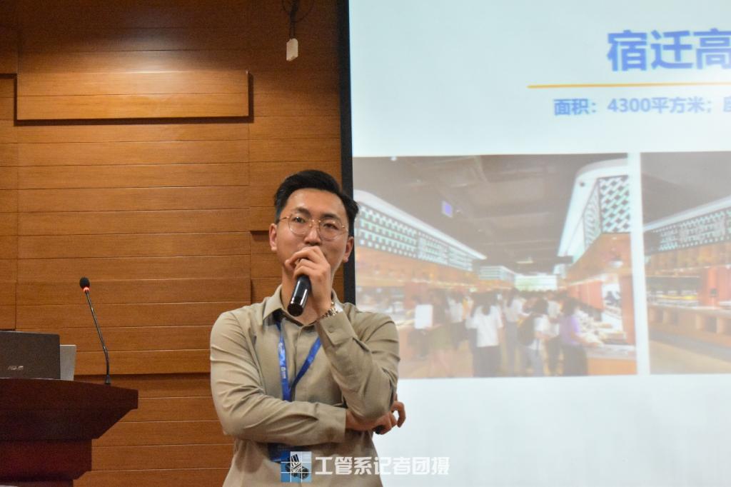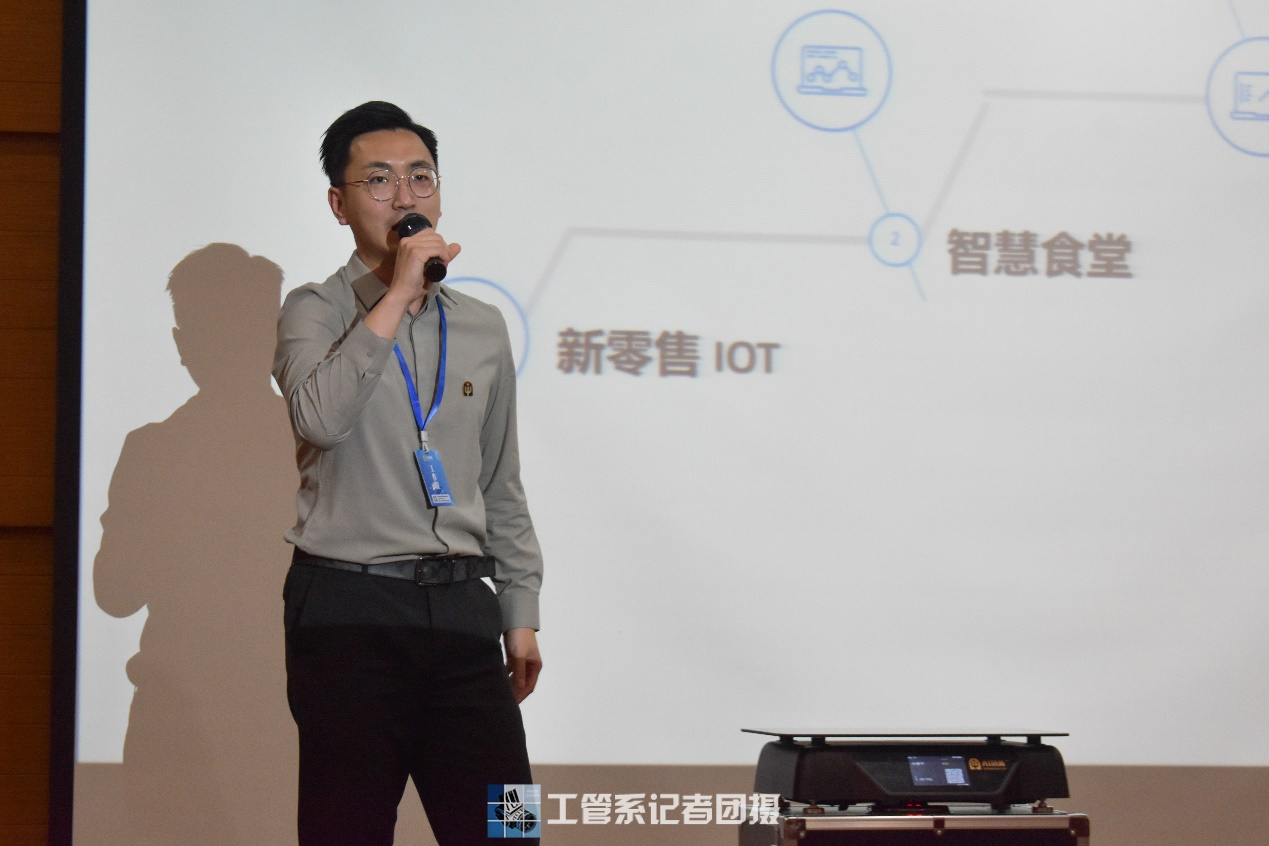 紧接着,主讲人周文光详细地介绍了自己的工作经历。他结合团餐行业增长点和行业变革思考这两个方面对团餐这个行业进行了分析。然后,他就“AI团餐赋能传统食堂”这个概念引出智能食堂这一模式,并具体地说明了智能食堂所具备的优点。最后,他向在座同学们展示了他们团队的研发产品,使大家对AI团餐这一行业有了更深的理解。