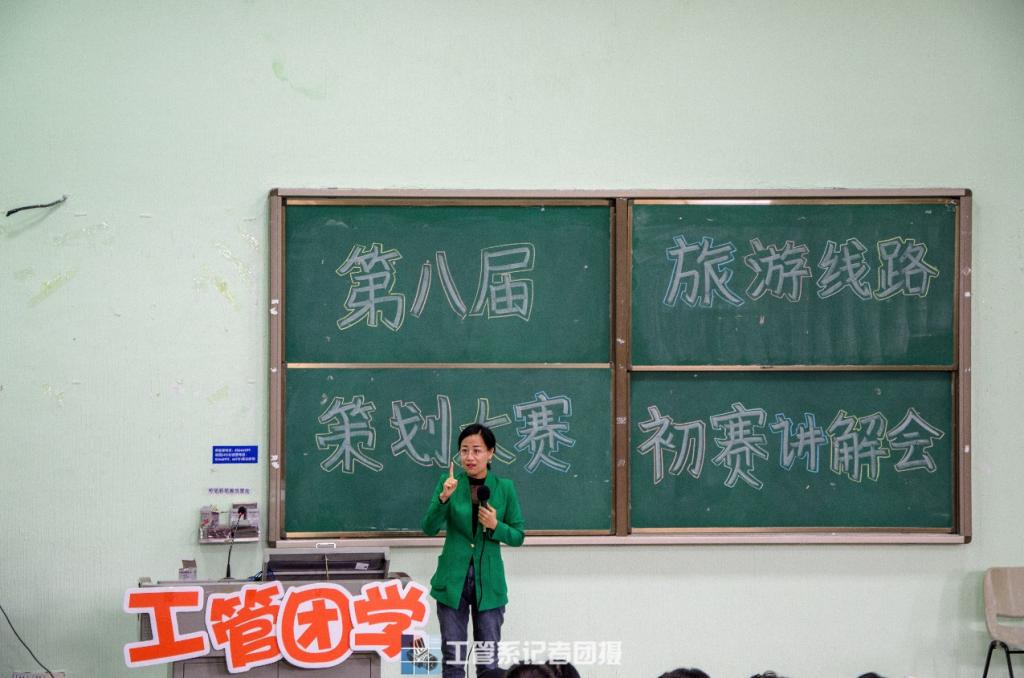 随后,由张丽娟老师上台为同学们详细地讲解了如何撰写一份优秀旅游线路的策划书。首先,她介绍了策划书的书写背景,希望同学们着眼于大时代、大背景,让策划书切合实际;接着,她强调了旅游线路策划书要根据当代背景提出问题,并根据问题提供合理的解决方案;随后,她提供了“爱国”和“育人”两个主题,希望参赛者们围绕这两个主题进行策划书的撰写。