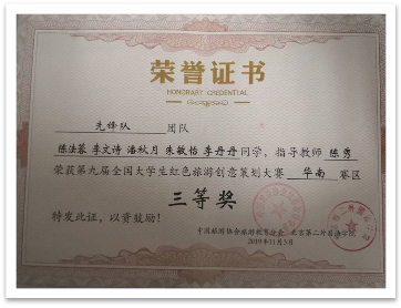在学习之外,她还注意提高自己的综合素质,积极参与校内外的各项比赛。在校内活动中,她参与“诵中华经典,凝报国之志”主题朗诵比赛、“众志成城共抗疫,挥洒青春担使命”征文比赛、第一届“微党课”比赛等活动,并三次代表原工商管理系到校级参与决赛,为院系争光。在校外竞赛中,令她印象最深刻的是,是参加第九届全国大学生红色旅游创意策划大赛中,并荣获华南赛区“三等奖”,在整个比赛策划过程,积极协调团队成员,与团队一起努力、一起思考,不断地完善策划内容。在大三期间,她与团队共同参加大学生创新创业训练计划项目,与团队追求精益求精,不断地修改和完善项目内容,最终《云研学》项目被确立为省级推荐项目。她始终坚信,要把知识真正地活用,所以她一直都积极参加各类学科竞赛,在每一个学科竞赛中,都收获颇多,努力做到立于课堂和书本,但不局限于课上的知识,积极投入更多的比赛实践。