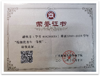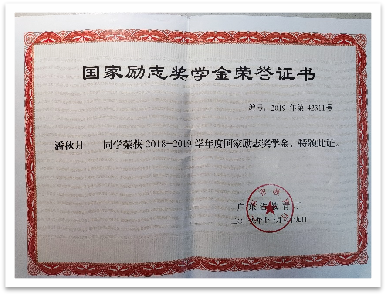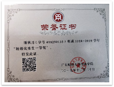 在校期间,她合理安排时间,做好自身学习规划,坚持把学习放在首位,努力学好专业基础知识,不断地提高自己专业素养,成绩一直处于稳步上升、名列前茅,连续三年获得“校级优秀生一等奖”。