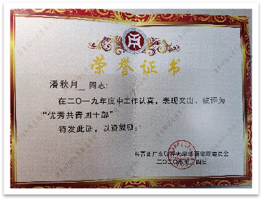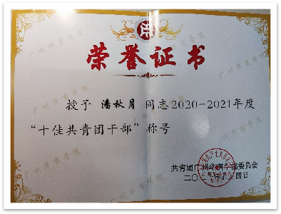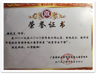 大学期间,她连续三年担任原工商管理系团总支学生会的学生干部,工作认真负责,连续两年获原工商管理系“优秀学生干部”以及校“十佳共青团干部”称号等荣誉。大一学年,任原工商管理系学生会学术部干事,主要负责原工商管理系和对接校级的学术活动。她积极学习新东西,协助部门工作,认真参与策划,促进部门工作的顺利进行。