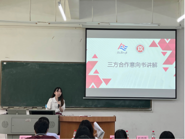 紧接着,曾嘉欣经理对大学生创业团队合作意向书进行讲解。讲解内容包括成立创业团队工作室意向、签订意向的项目结算标准、三方权利义务三个部分。