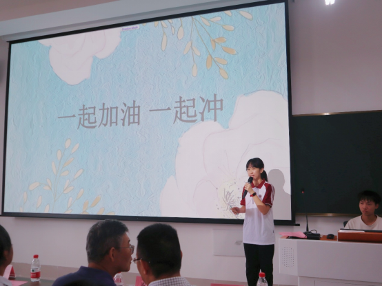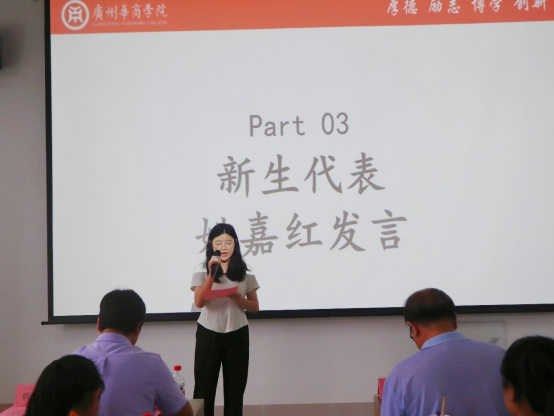 新生代表姚嘉红同学用真挚坚定的话语表达了自己对大学生活的向往,期待未来更多的机遇和挑战,期待结交八方英才,期待四年后变得更加成熟稳重和自信。声动人心,铿锵有力。