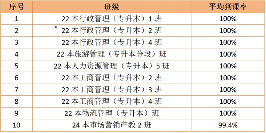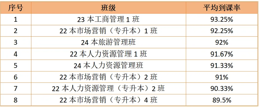 经检查,2024-2025学年第二学期(截至2025年3月底)威廉希尔中文网站全体班级考勤数据现公布如下。现对考勤工作表现突出的班级予以通报表扬,对考勤率未达标的班级提出整改要求。具体通报如下: