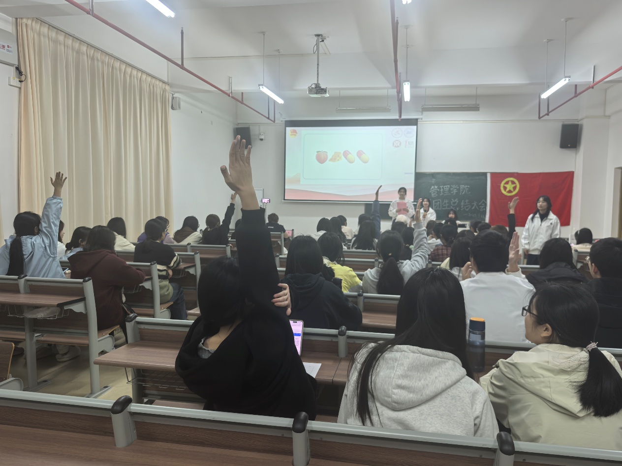 紧接着,大会就进行到了趣味横生的互动环节。同学们积极踊跃地参与两轮有趣的游戏,大会现场洋溢着欢快的氛围。