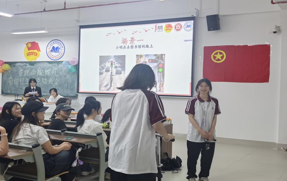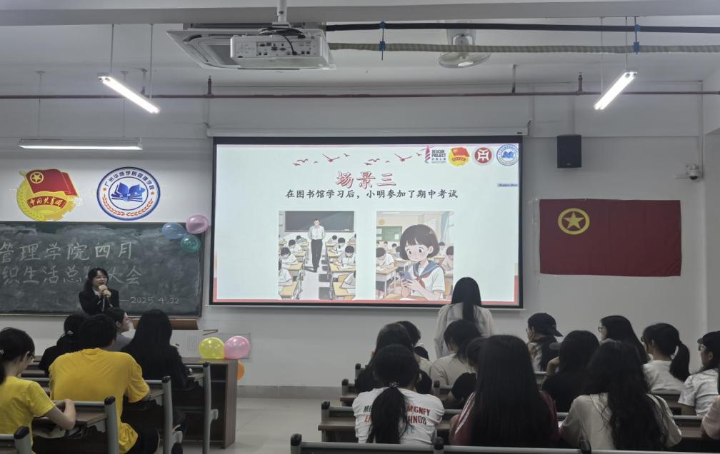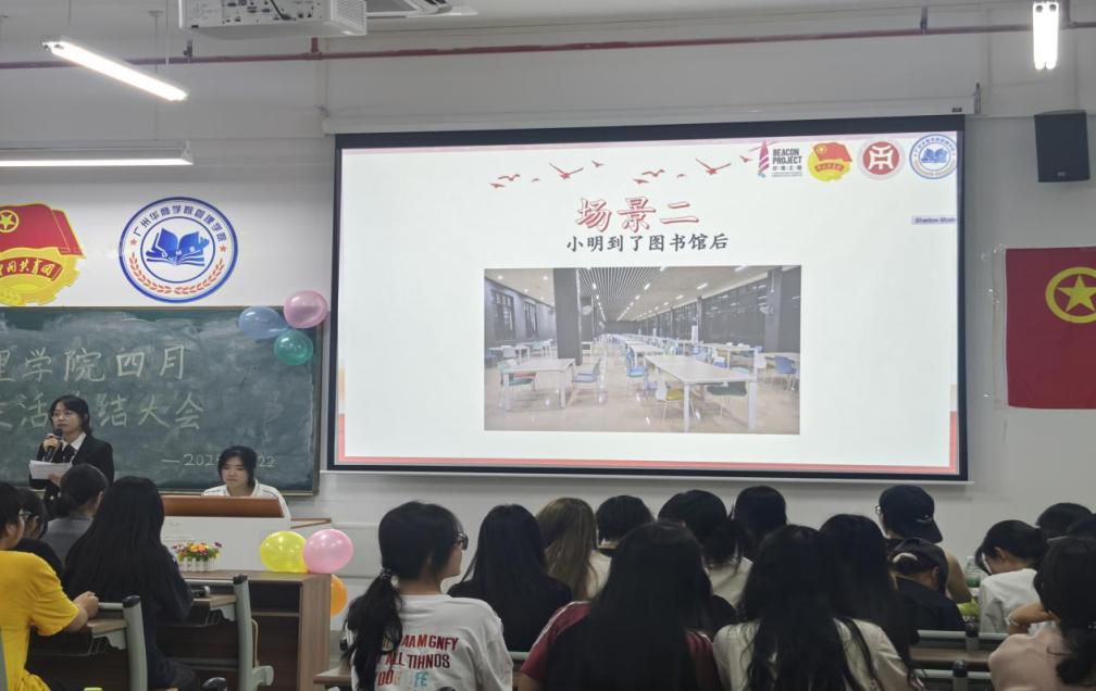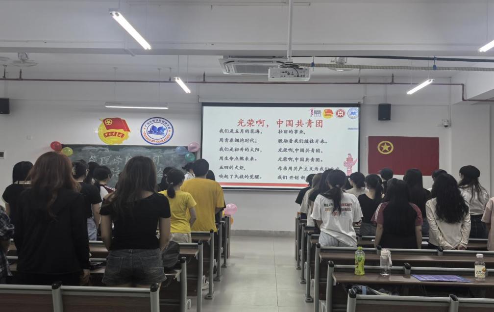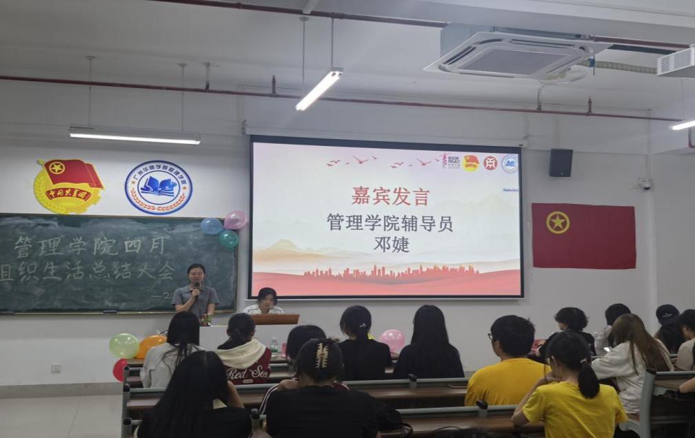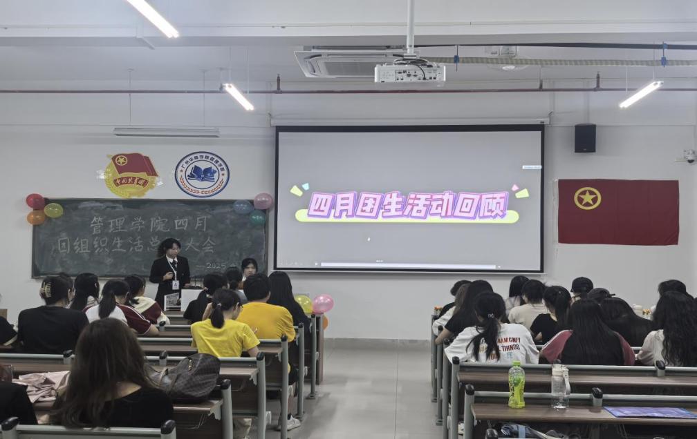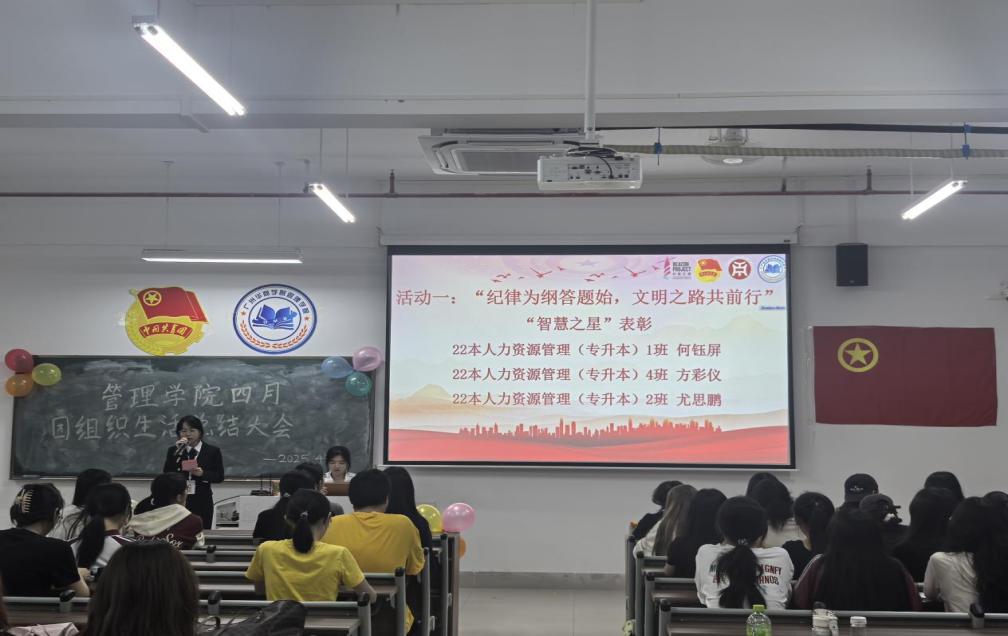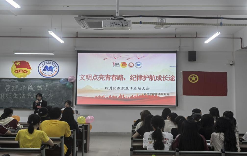 威廉希尔中文网站团委于4月22日晚上7时,在肇庆校区16号楼408教室举办主题为“文明点亮青春路,纪律护航成长途”四月团组织生活总结大会,广州校区采用线上直播的形式同时举行。