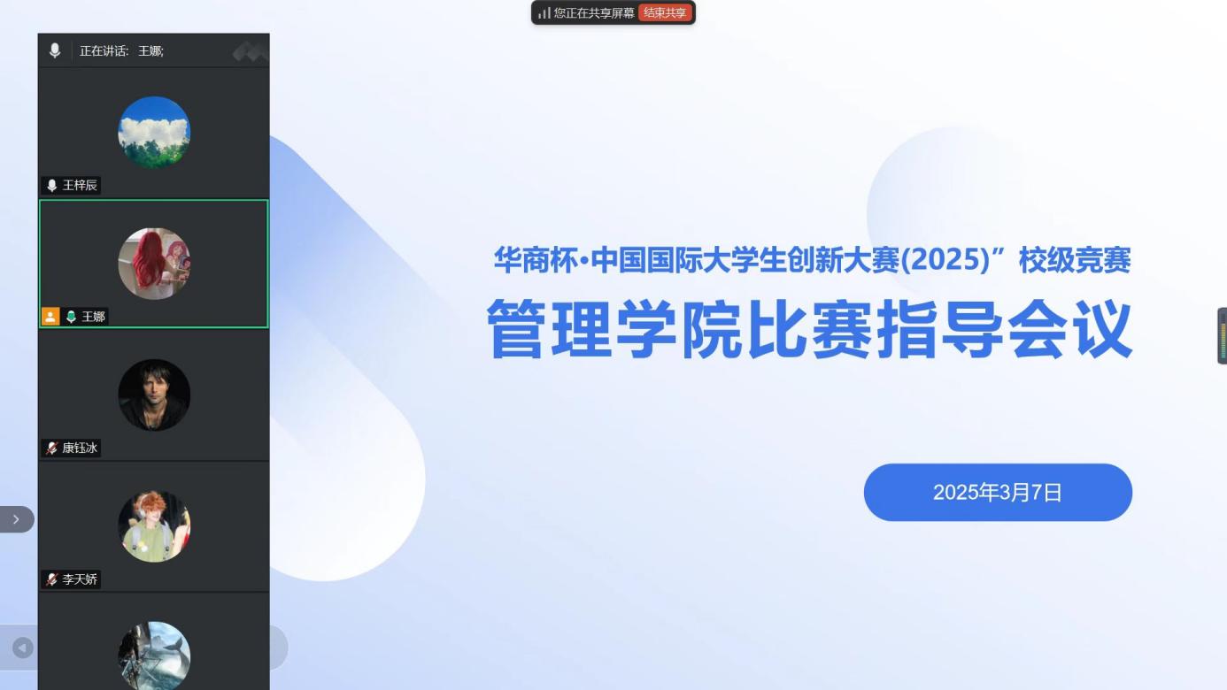 2025年3月7日晚上,威廉希尔中文网站在线上成功召开了华商杯·中国国际大学生创新大赛(2025)比赛指导会议。双创秘书王梓辰与人力资源管理系副主任田宇对参赛项目进行了指导,帮助学生调整了项目方向,明确了“解决现实需求,关注市场机会”的思路。
