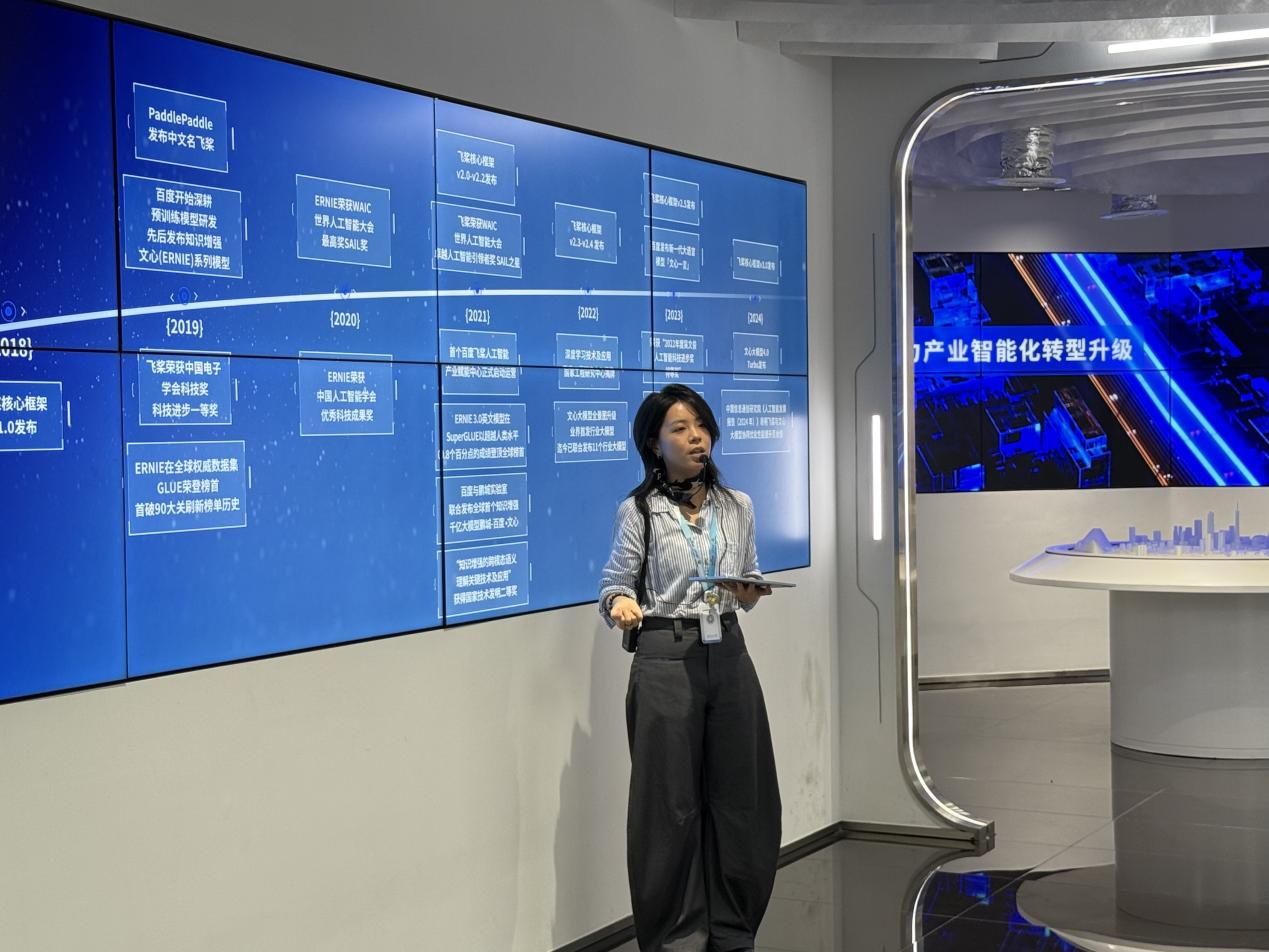 在培训课程设置上,内容丰富且极具前沿性。通过参观百度飞桨AI展厅,学生们目睹了人工智能在智能交通、医疗健康、金融风控、智能制造等多个行业的广泛应用,从宏观角度构建了完整的人工智能知识框架,为日后的创新实践打下了坚实的理论基础。例如,在展厅内,同学们亲自体验了智能语音助手的便捷,见证了图像识别系统在安防等领域的精准应用,这些生动的案例让他们深刻认识到人工智能技术的强大力量以及在各领域蕴含的无限商机。