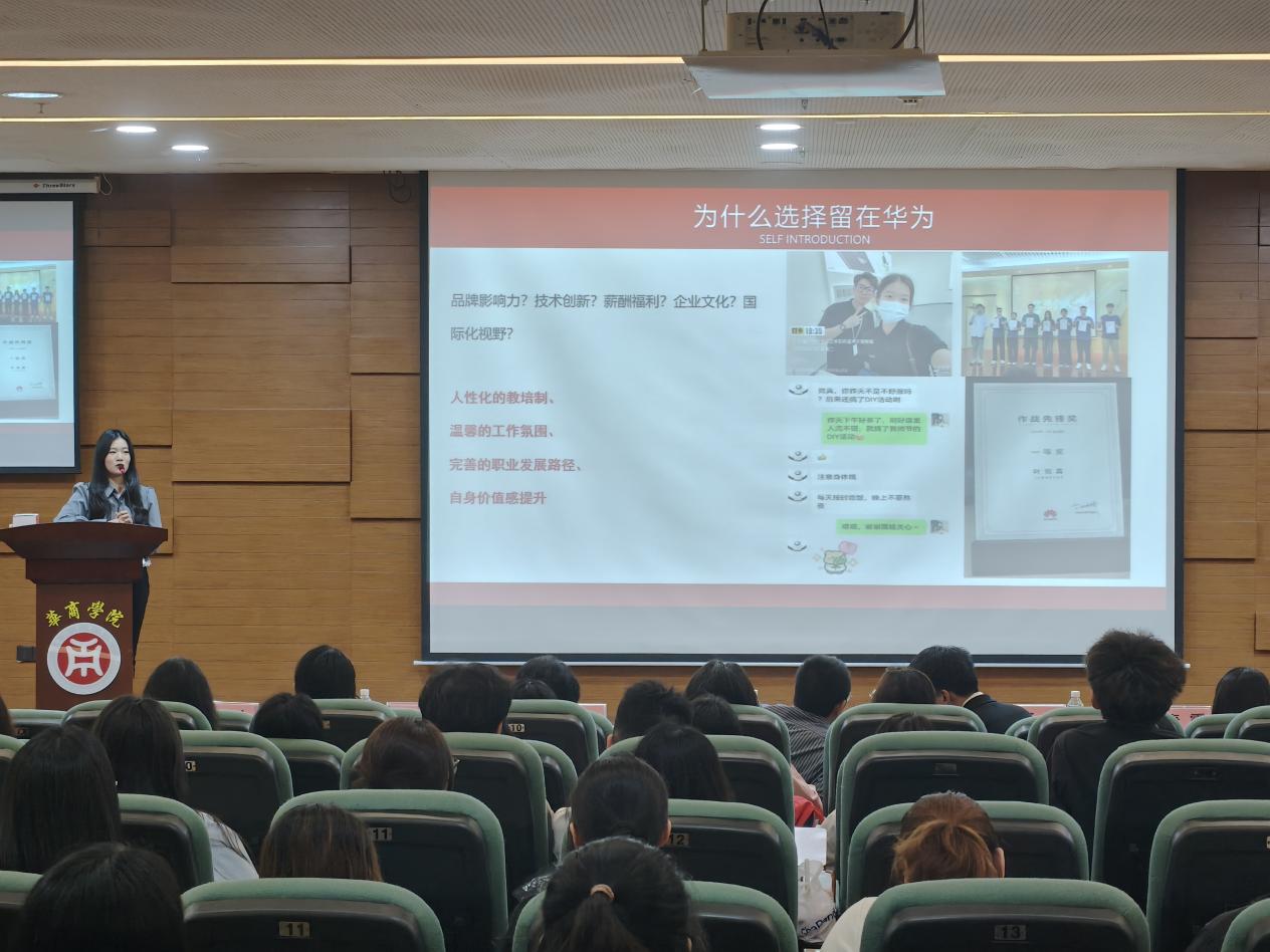 在问答环节,针对“如何平衡理想与现实工作的落差”“非技术岗如何提升竞争力”等问题,叶师姐结合华为真实案例一一解答,并强调:“职场没有‘对口’之说,只有‘适配’与否。学校赋予我们的商科思维,正是穿透行业壁垒的‘通用武器’。”