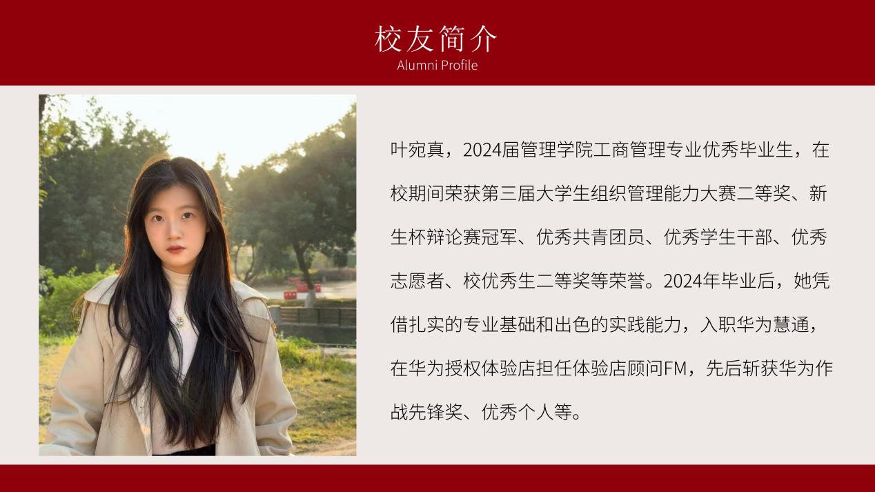 二十载风雨兼程,二十载桃李芬芳。为隆重庆祝威廉希尔中文网站成立二十周年校庆,威廉希尔中文网站推出喜迎二十周年校庆专题活动之校友大讲坛,邀请各行业杰出校友重返校园,分享成长故事与职场智慧。2025年4月9日,威廉希尔中文网站校友大讲坛本期邀请到了2024届优秀毕业生叶宛真师姐,她以亲身经历为师弟师妹们揭秘她从华商管院走向华为慧通的职场进阶密码,分享如何在华为慧通找准定位、快速成长。
