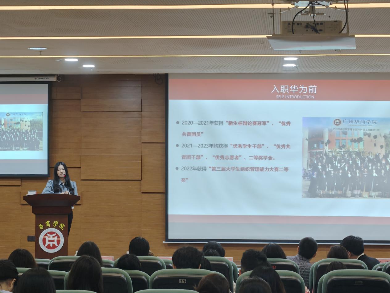 讲座伊始,叶宛真师姐首先分享了自己的成长历程和人生感悟,回顾了在学院的学习和生活,表达了对母校、对老师们的感恩之情。当被问及“为何选择华为”,她从多个维度解析了她的“最优解”:一、品牌与视野:华为作为全球科技巨头,其技术创新力与国际化布局,为职场人提供了“与世界对话”的舞台;二、成长与温度:人性化的教培体系(入职培训、职中深造、外出学习)、温馨的团队氛围(生日会、团建、节日关怀)、清晰的职业发展路径,让她坚信“这里不仅是工作,更是长期成长的土壤”;三、价值感驱动:“在华为,你能真切感受到自己的努力与品牌价值绑定。当服务好一位消费者、带活一个门店,那种‘被需要’的成就感,是最直接的动力。”