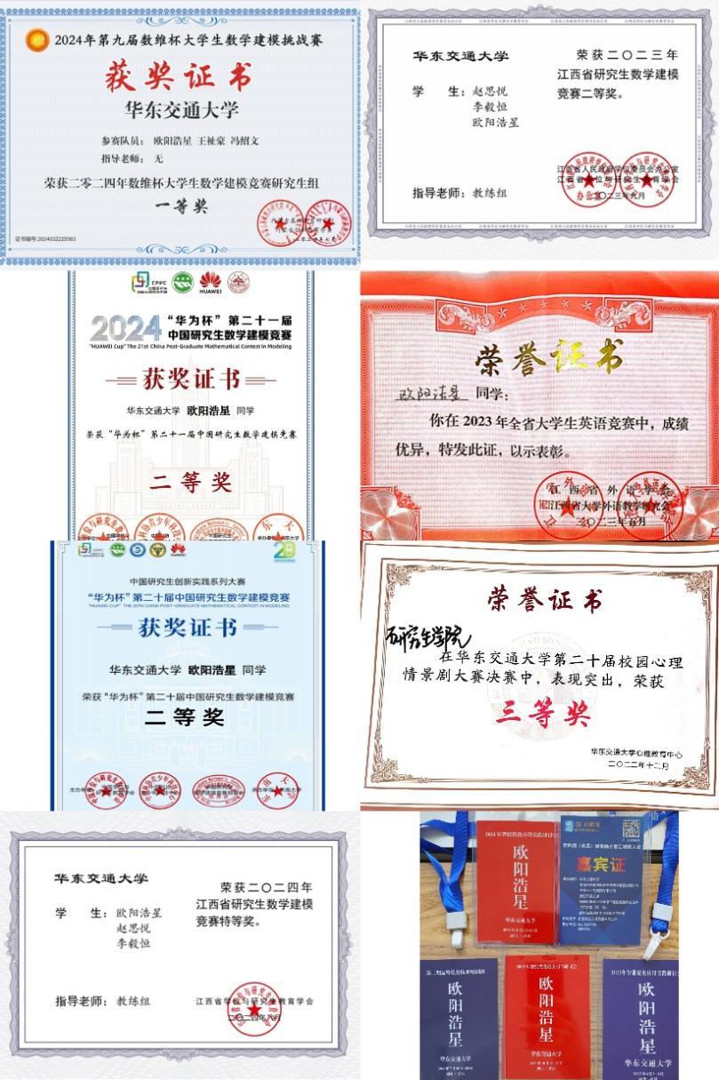 学术研究之余,欧阳浩星积极参加学科竞赛,累计获得国家级奖项3项、省部级3项、校级1项。为拓展学术视野,他主动参加各类学术会议近10场,在其中他结识了许多国内外优秀学者,获得了与名师面对面交流的机会。闲暇时光,他还会积极参加学校(学院)组织的志愿服务活动,累计服务时长超过270小时,展现了全面发展的综合素质。