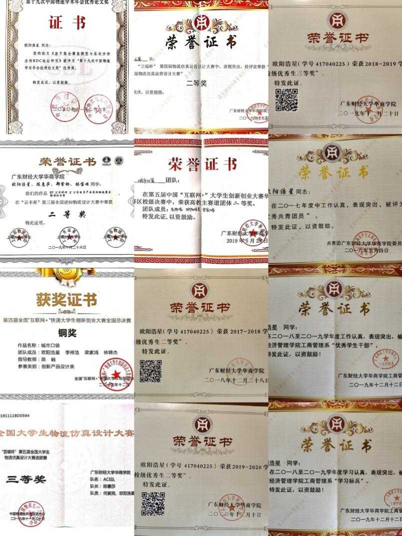 四载寒窗,欧阳浩星的学习成绩一直排名班级前列,他以华商学院为第一单位发表学术论文1篇,在各类竞赛中斩获7项荣誉(其中国家级3项,省部级1项,校级3项),用累累硕果印证了“博观而约取,厚积而薄发”的深刻内涵。